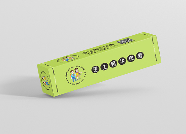 設計理念:芝士烤牛肉卷盒面版式設計,以主題相關文字內容進行排版,加入“芝士烤牛肉卷”、“手工現烤·一口入魂”等字樣,整個包裝盒較為簡潔,左面放上公司的品牌logo,配上小學生的圖片,帶動消費者“穿越”回美好的讀書時光,激發共鳴,增加用戶對產品的好感。
